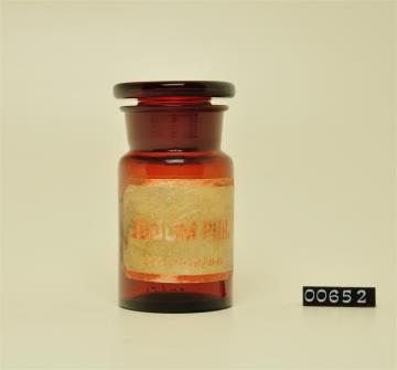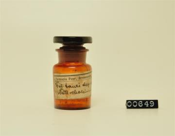 Rundes, braunes Pulverglas mit flachem Schliffstopfen. Verdickter, abgeflachter Mündungsrand. Etikettiert