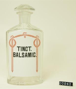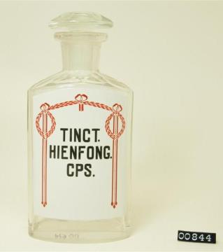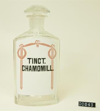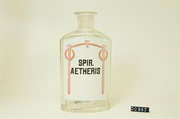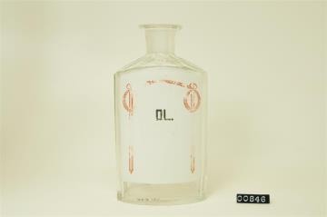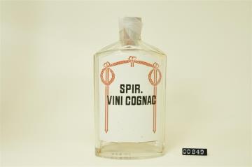 Ovalgriffige, halb geschliffene, farblose Standflasche. Schulter, Hals, Stopfen und Boden geschliffen und poliert. Eingebranntes, weißes Emailleschild über die gesamte Vorderwand mit jugendstilähnlicher, rotbrauner Randdekoration (Blattgirlande mit Bändern).