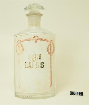 Ovalgriffige, halb geschliffene, farblose Standflasche. Schulter, Hals, Stopfen und Boden geschliffen und poliert. Eingebranntes, weißes Emailleschild über die gesamte Vorderwand mit jugendstilähnlicher, rotbrauner Randdekoration (Blattgirlande mit Bändern). Schwarz signiert.