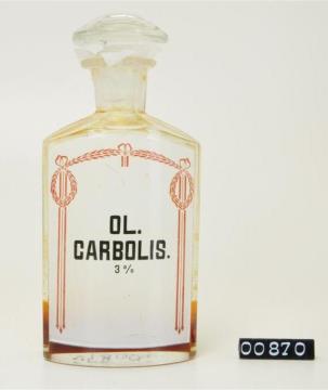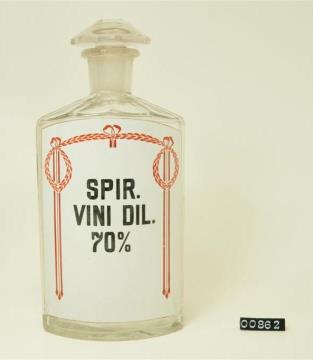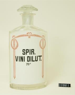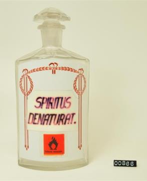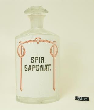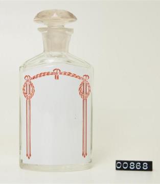 Ovalgriffige, halb geschliffene, farblose Standflasche. Schulter, Hals, Stopfen und Boden geschliffen und poliert. Eingebranntes, weißes Emailleschild über die gesamte Vorderwand mit jugendstilähnlicher, rotbrauner Randdekoration (Blattgirlande mit Bändern). Nicht signiert.
