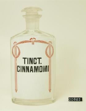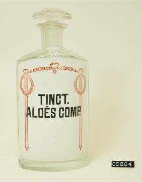 Ovalgriffige, halb geschliffene, farblose Standflasche. Schulter, Hals, Stopfen und Boden geschliffen und poliert. Eingebranntes, weißes Emailleschild über die gesamte Vorderwand mit jugendstilähnlicher, rotbrauner Randdekoration (Blattgirlande mit Bändern). Überzogenes Selbstklebeetikett. Schwarze Schrift.