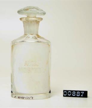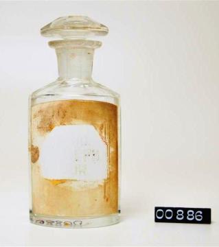 Ovalgriffige, halb geschliffene, farblose Standflasche. Schulter, Hals, Stopfen und Boden geschliffen und poliert. Eingebranntes, weißes Emailleschild über die gesamte Vorderwand mit jugendstilähnlicher, rotbrauner Randdekoration (Blattgirlande mit Bändern). Mit Papierschild überklebt. Schwarz signiert.