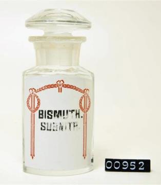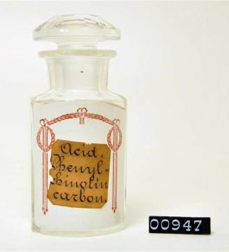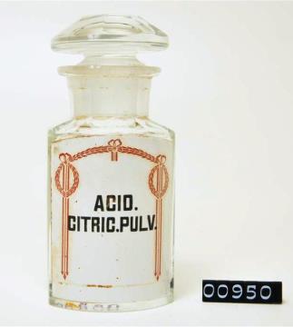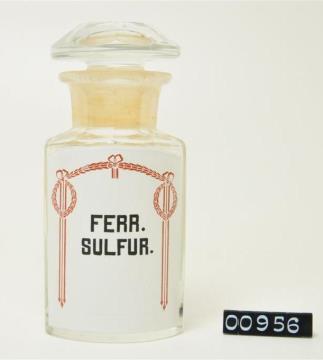 Ovalgriffiges, halb geschliffenes, farbloses Pulverglas. Schulter, Hals, Stopfen und Boden geschliffen und poliert. Eingebranntes, weißes Emailleschild über die gesamte Vorderwand mit jugendstilähnlicher, rotbrauner Randdekoration (Blattgirlande mit Bändern). Schwarz signiert. Enthält Eisenpulver.