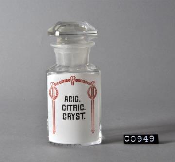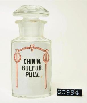 Ovalgriffiges, halb geschliffenes, farbloses Pulverglas. Schulter, Hals, Stopfen und Boden geschliffen und poliert. Eingebranntes, weißes Emailleschild über die gesamte Vorderwand mit jugendstilähnlicher, rotbrauner Randdekoration (Blattgirlande mit Bändern). Schwarz signiert.