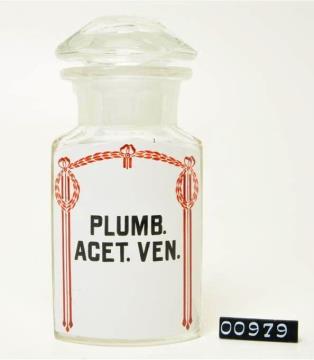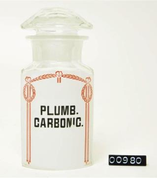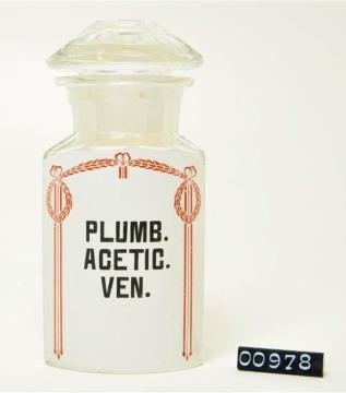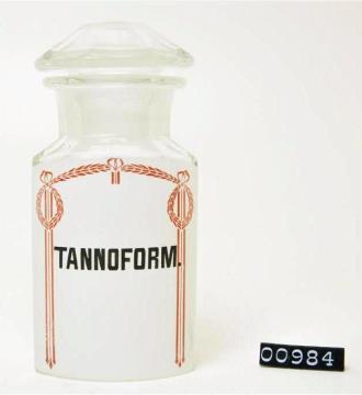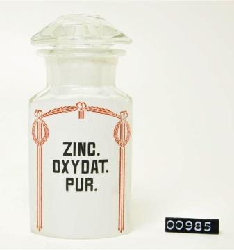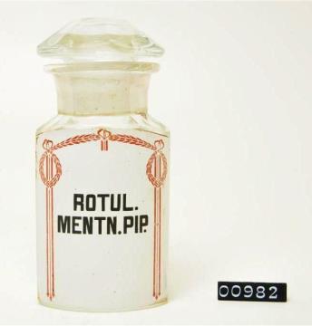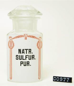 Ovalgriffiges, halb geschliffenes, farbloses Pulverglas. Schliffstopfen mit ringförmigem Hefteisenabriss. Schulter, Hals, Stopfen und Boden geschliffen und poliert. Eingebranntes, weißes Emailleschild über die gesamte Vorderwand mit jugendstilähnlicher, rotbrauner Randdekoration (Blattgirlande mit Bändern). Schwarz signiert.