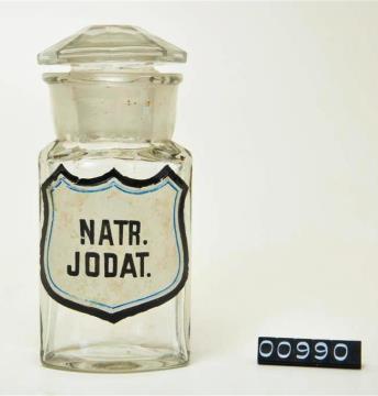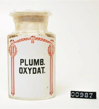 Ovalgriffiges, gepreßtes, farbloses Pulverglas. Stopfen mit kreisförmigem Hefteisenabriss, geschliffen. Eingebranntes, geschwungenes, weißes Emailleschild mit hellblauem und schwarzem Rand. Schwarz signiert.