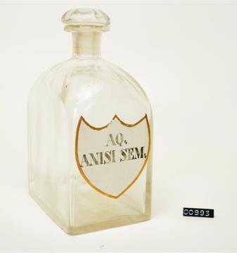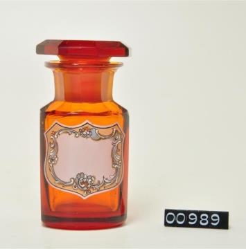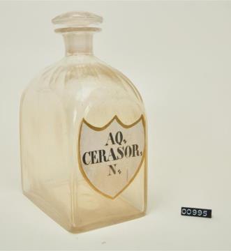 Ovalgriffiges, gepreßtes, farbloses Pulverglas. Schulter, Hals, Stopfen und Boden geschliffen und poliert. Eingebranntes weißes Emailleschild in der Form einer barocken Kartusche mit rotbrauner Schrift und Dekor. Signiert.