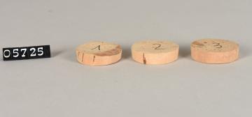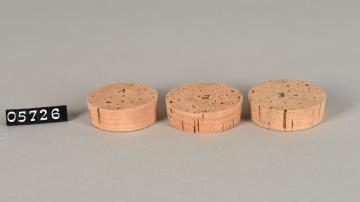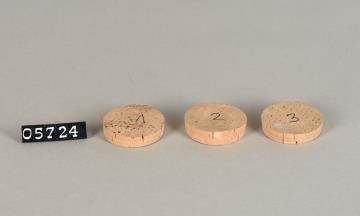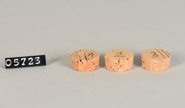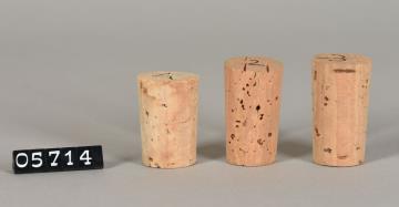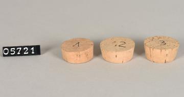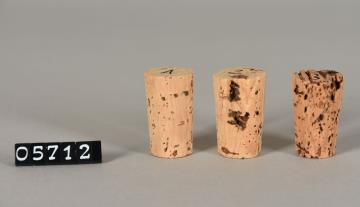 Verschiedene Naturkorken, aus natürlicher Korkrinde gewonnen. Verschiedene Größen, rund, konisch verjüngend zusammenlaufend, d.h. der obere Durchmeser ist größer als der untere Durchmesser des Korkens. Für diese konischen Korken, Spitzkorken genannt, benötigt man kein Werkzeug zum Aufstecken. Unterschiedliche Qualitäten. Mit Originalanhänger der Firma Chemofarm, Bozen.