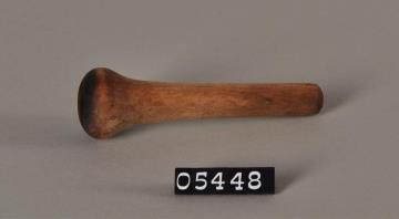 Hölzernes Werkzeug aus Hartholz mit eingelassenem vorne leicht angerauhtem Steinkopf. Zylindrischer Holzgriff mit oben knopfmäßig sich vergrößernd. Knopf ausgearbeitet. Der Pistill wird zum Verreiben und Mischen von cremigen oder pulvrigen Substanzen verwendet.