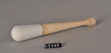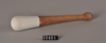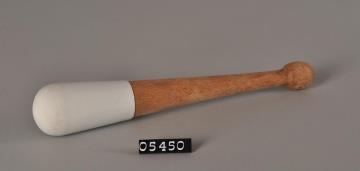 Hölzernes Werkzeug aus Hartholz mit eingelassenem vorne angerauhtem Porzellanknopf. Zylindrischer Holzgriff mit oben knopfmäßig sich vergrößernd. Der Pistill wird zum Verreiben und Mischen von cremigen oder pulvrigen Substanzen verwendet.
