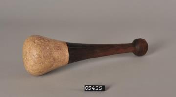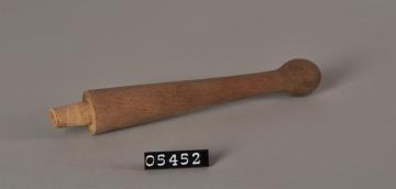 Hölzernes Werkzeug aus Hartholz mit eingelassenem sich glockenförmig erweiternden Keramikknopf. Zylindrischer Holzgriff. Der Pistill wird zum Verreiben und Mischen von cremigen oder pulvrigen Substanzen verwendet.