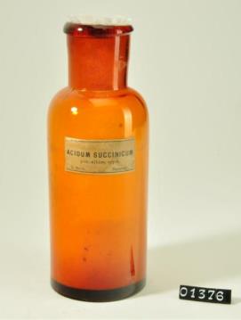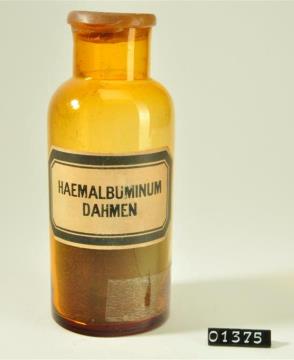 Rundes, braunes Pulverglas mit Stopfen. Mündungsrand mit umgelegtem Faden. Mit Bodebnprägung des Volumens. Mit Signierapparat bedrucktes und mit Schilderlack überzogenes Papierschild, achteckig, mit schwarzem Doppelrand und schwarzer Schrift auf ehemals weißem Grund.