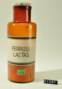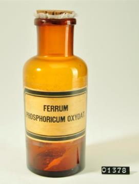 Rundes, braunes Pulverglas mit Stopfen. Mündungsrand mit umgelegtem Faden. Mit Abreibebuchstaben beschriftetes und mit Klarsichtfolie überzogenes Papierschild, achteckig, mit schwarzem Doppelrand und schwarzer Schrift auf ehemals weißem Grund.