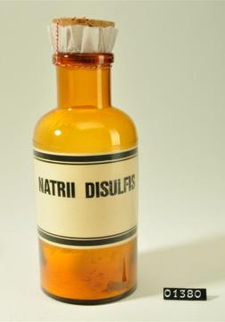 Rundes, braunes Pulverglas mit Stopfen. Mündungsrand mit umgelegtem Faden. Mit Schablone beschriftetes und mit Klarsichtfolie überzogenes Papierschild, achteckig, mit schwarzem Doppelrand und schwarzer Schrift auf ehemals weißem Grund. Darunter rotes Warnschild mit schwarz aufgedrucktem Andreaskreuz.