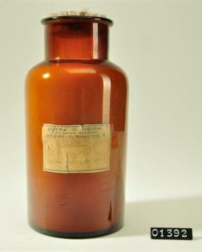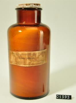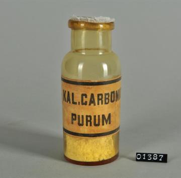 Rundes, hellbraunes Pulverglas mit Stopfen. Mündungsrand mit umgelegtem Faden. Mit Signierapparat beschriftetes und mit Etikettenlack überzogenes Papierschild, achteckig, mit schwarzem Rand und schwarzer Schrift auf ehemals weißem Grund. Enthält Pottasche.