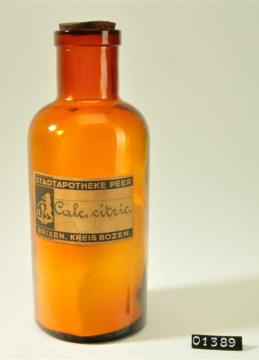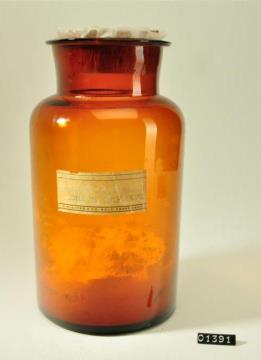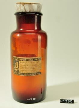 Rundes, braunes Pulverglas mit Stopfen. Verdickter, gerundeter Mündungsrand. Mit Signierapparat beschriftetes und mit Etikettenlack überzogenes Papierschild, achteckig, mit rotem Rand und schwarzer Schrift auf ehemals weißem Grund. darunter rechteckiges, gezähntes Etikett mit schwarzer Schrift auf weißem Grund. Handschriftliche Angaben schlecht lesbar.