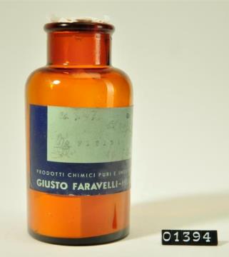 Rundes, braunes Pulverglas mit Stopfen. Flacher, gerundeter Mündungsrand. Original-Etikett der Firma Merck mit handschriftlicher Ergänzung des Einkaufsdatums (22.11.1961) von Ignaz Peer II, darunter gezahntes rundes Qualitätssiegel.