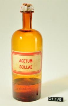 Runde, braune Enghalsflasche mit weiß-rotem Rezepturfaden gesichertem Stopfen. Flacher, ausladender Mündungsrand. Mit Signierapparat bedrucktes und mit Schilderlack überzogenes Papierschild, achteckig, mit rotem Doppelrand und roter Schrift auf ehemals weißem Grund.