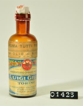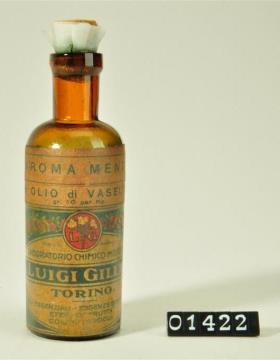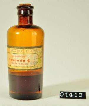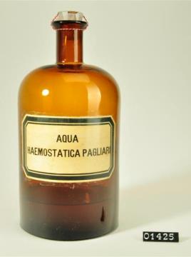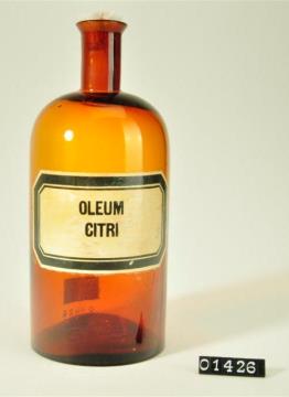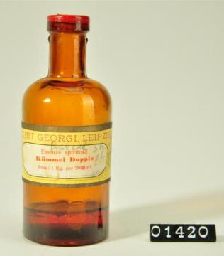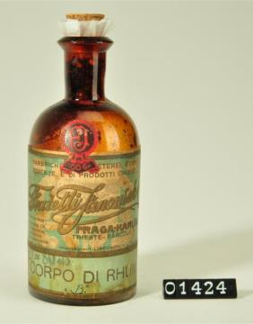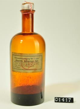 Runde, braune Enghalsflasche mit, rot-weißem Rezepturfaden gesichertem Stopfen. Ausladender Mündungsrand. Mit Signierapparat beschriftetes und mit Etikettenlack überzogenes Papierschild, achteckig, mit schwarzem Doppelrand und schwarzer Schrift auf ehemals weißem Grund.