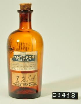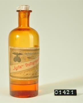 Runde, braune Enghalsflasche mit, rot-weißem Rezepturfaden gesichertem Stopfen. Verdickter, flacher Mündungsrand. Etikettiert