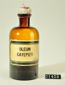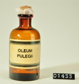 Runde, braune Enghalsflasche mit rot-weißem Rezepturfaden gesichertem Stopfen. Ausladender Mündungsrand. Mit Signierapparat bedrucktes und mit Etikettenlack überzogenes Papierschild, achteckig, mit schwarzem Doppelrand und schwarzer Schrift auf ehemals weißem Grund.