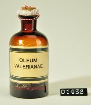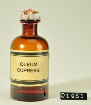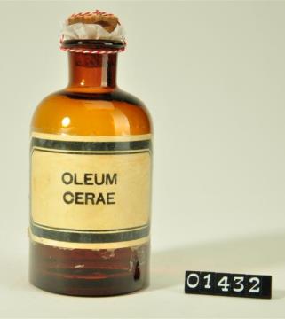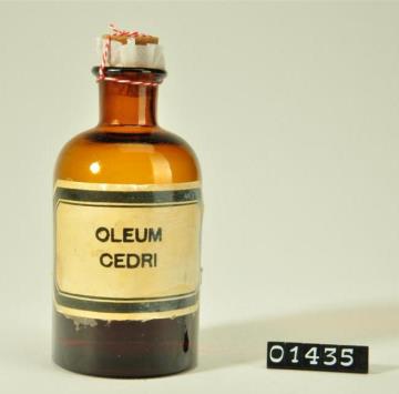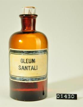 Runde, braune Enghalsflasche mit, rot-weißem Rezepturfaden besichertem Stopfen. Ausladender Mündungsrand. Mit Signierapparat bedrucktes und mit Etikettenlack überzogenes Papierschild, achteckig, mit schwarzem Doppelrand und schwarzer Schrift auf ehemals weißem Grund.