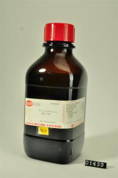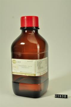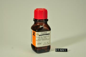 Braune Vierkantflasche mit Weithals und schwarzem Schraubverschluss. Mit Abreibebuchstaben beschriftetes und mit Klarsichtfolie überzogenes Papierschild, achteckig, mit schwarzem Doppelrand und schwarzer Schrift auf ehemals weißem Grund. Darunter rotes Warnschild mit schwarz aufgedrucktem Flammensymbol. Mit weißem Filzstift Chargennummer am unteren Rand (Charge 1 vom Mai 1993). Beschriftet von Elisabeth Fehrenbach-Peer.