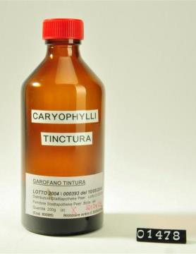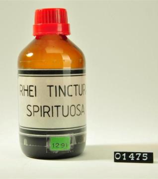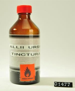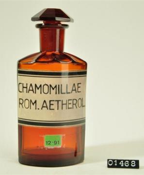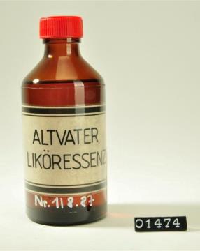 Ovalgriffige, halb geschliffene, braune Vorratsflasche. Schulter, Hals, Stopfen und Boden geschliffen und poliert. Mit Schablone beschriftetes und mit Klarsichtfolie überzogenes Papierschild, achteckig, mit schwarzem Doppelrand und schwarzer Schrift auf weißem Grund. Im Dezember 1991 aus dem Sortiment genommen (grünes Schild).