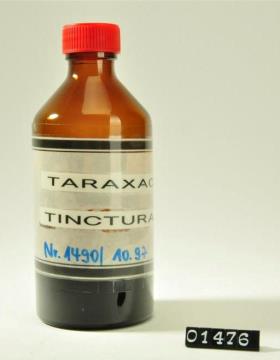 Runde, braune Tropfflasche mit Ausguss und Stopfen (Massivstopfen mit kugelförmigem Griff mit Kerbe). Mit Rezepturfaden Stopfen gesichert. Verdickter, abgeflachter Mündungsrand. Signiert mit Schreibmaschine von Ignaz Peer II auf Apothekenetikett.