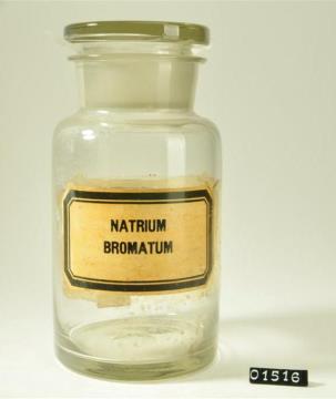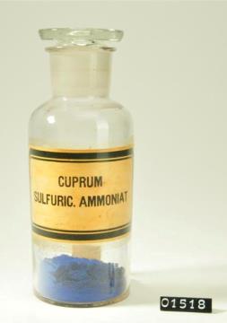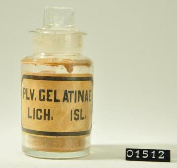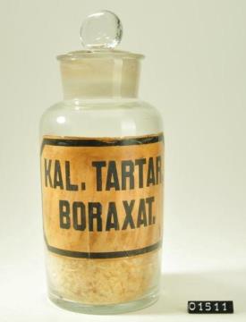 Rundes, farbloses Pulverglas mit Schliffstopfen. Hohlstopfen mit rechteckigem Griff und Hefteisenabriss. Ausladender, abgeflachter Mündungsrand. Mit Signierapparat bedrucktes Papierschild, achteckig, mit schwarzem Rand und schwarzer Schrift auf ehemals weißem Grund. Mit Schilderlack überzogen.