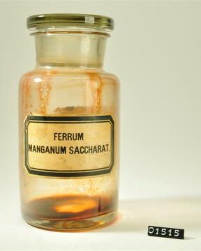 Rundes, farbloses Pulverglas mit Schliffstopfen. Hohlstopfen mit Hefteisenabriss. Ausladender, abgeflachter Mündungsrand. Mit Signierapparat bedrucktes Papierschild, achteckig, mit schwarzem Rand und schwarzer Schrift auf ehemals weißem Grund. Mit Schilderlack überzogen.