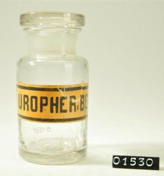 Rundes, farbloses Pulverglas mit Schliffstopfen. Hohlstopfen mit Hefteisenabriss. Ausladender Mündungsrand. Mit Signierapparat bedrucktes Papierschild, achteckig, mit schwarzem Doppelrand und schwarzer Schrift auf ehemals weißem Grund. Mit Schilderlack überzogen.