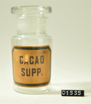 Rundes, farbloses Pulverglas mit Schliffstopfen. Hohlstopfen mit Hefteisenabriss. Verdickter, abgeflachter Mündungsrand. Mit Signierapparat bedrucktes Papierschild, achteckig, mit schwarzem Rand und schwarzer Schrift auf ehemals weißem Grund. Mit Schilderlack überzogen.