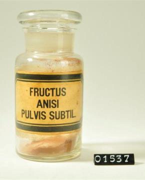 Rundes, farbloses Pulverglas mit Schliffstopfen. Hohlstopfen mit Hefteisenabriss. Ausladender Mündungsrand. Mit Signierapparat bedrucktes Papierschild, achteckig, mit schwarzem Doppelrand und schwarzer Schrift auf ehemals weißem Grund. Mit Schilderlack überzogen. Mit Substanzresten, vermutlich Sternanispulver.
