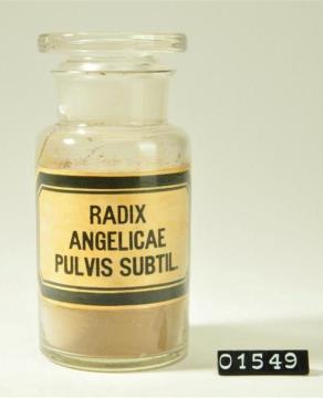 Rundes, farbloses Pulverglas mit Schliffstopfen. Hohlstopfen mit Hefteisenabriss. Ausladender, flacher Mündungsrand. Mit Signierapparat bedrucktes Papierschild, achteckig, mit schwarzem Doppelrand und schwarzer Schrift auf ehemals weißem Grund. Mit Schilderlack überzogen. Im Dezember 1991 aus dem Sortiment genommen (grünes Schild).