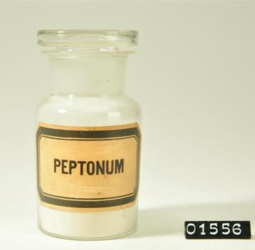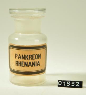 Rundes, farbloses Pulverglas mit Schliffstopfen. Hohlstopfen mit Hefteisenabriss. Verdickter, flacher Mündungsrand. Mit Signierapparat bedrucktes Papierschild, achteckig, mit schwarzem Rand und schwarzer Schrift auf ehemals weißem Grund. Mit Schilderlack überzogen.
