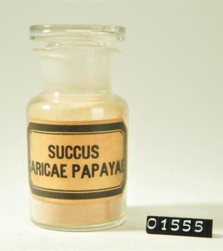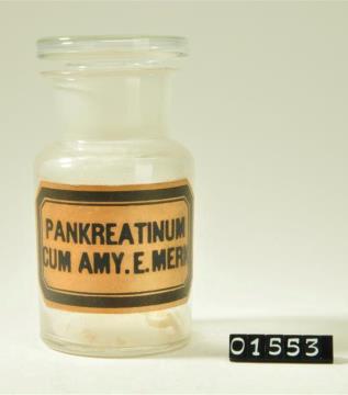 Rundes, farbloses Pulverglas mit Schliffstopfen. Hohlstopfen mit Hefteisenabriss. Verstärkter, abgeflachter Mündungsrand. Mit Signierapparat bedrucktes Papierschild, achteckig, mit schwarzem Doppelrand und schwarzer Schrift auf ehemals weißem Grund. Mit Schilderlack überzogen.