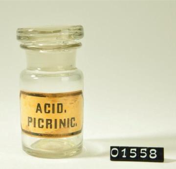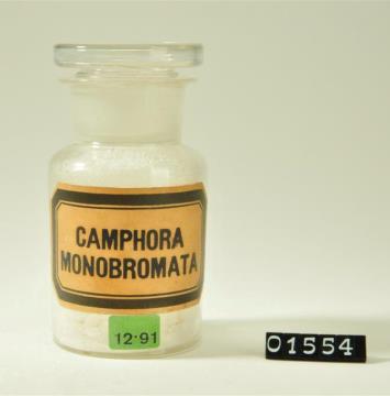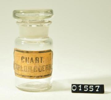 Rundes, farbloses Pulverglas mit Schliffstopfen. Hohlstopfen mit Hefteisenabriss. Ausladender Mündungsrand. Mit Signierapparat bedrucktes Papierschild, achteckig, mit schwarzem Doppelrand und schwarzer Schrift auf ehemals weißem Grund. Mit Schilderlack überzogen.