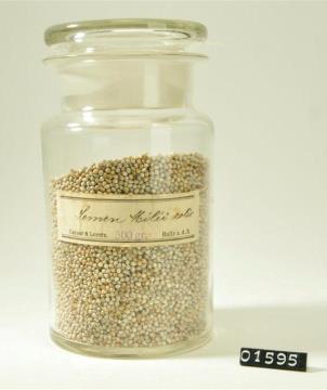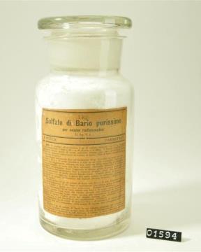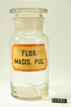 Rundes, farbloses Pulverglas mit Schliffstopfen. Hohlstopfen mit Hefteisenabriss. Ausladender, abgeschrägter Mündungsrand. Mit Signierapparat bedrucktes und mit Schilderlack überzogenes Papierschild, achteckig, mit rotem Rand und schwarzer Schrift auf ehemals weißem Grund.