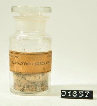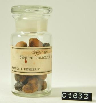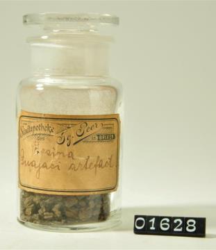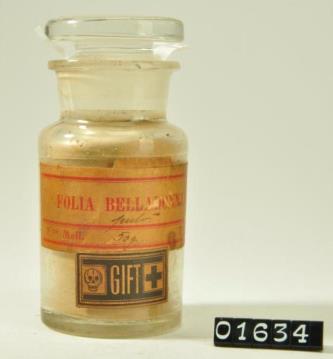 Rundes, farbloses Pulverglas mit Schliffstopfen. Hohlstopfen mit Hefteisenabriss. Ausladender, flacher Mündungsrand. Originaletikett der Firma Merck.