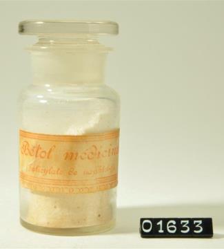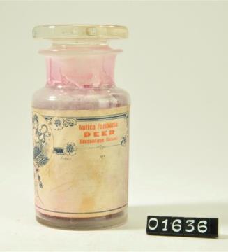 Rundes, farbloses Pulverglas mit Schliffstopfen. Hohlstopfen mit Hefteisenabriss. Ausladender, flacher Mündungsrand. Handschriftlich signiert. Etikett der Farmacia Peer, Bressanone.