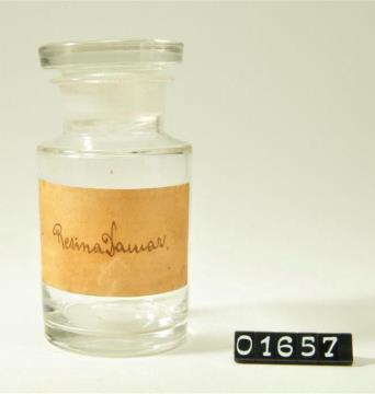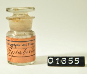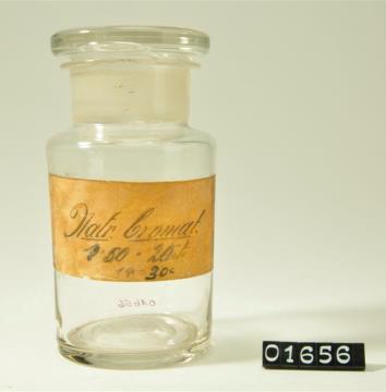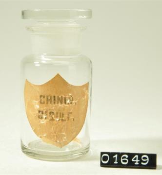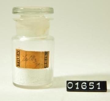 Rundes, farbloses Pulverglas mit Schliffstopfen. Hohlstopfen mit Hefteisenabriss. Ausladender Mündungsrand. Mit Signierapparat bedrucktes und mit Schilderlack überzogenes Papierschild, achteckig, mit rotem Rand und roter Schrift auf ehemals weißem Grund.
