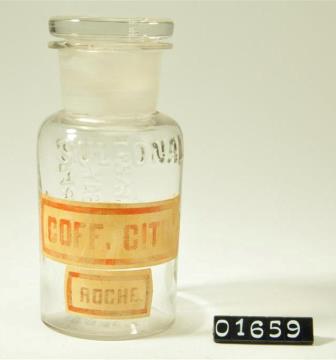 Rundes, farbloses Pulverglas mit Schliffstopfen. Hohlstopfen mit Hefteisenabriss. Ausladender Mündungsrand. Mit Signierapparat bedrucktes und mit Schilderlack überzogenes Papierschild, rechteckig, mit rotem Rand und roter Schrift auf ehemals weißem Grund. Darunter kleineres Schild mit "Roche".