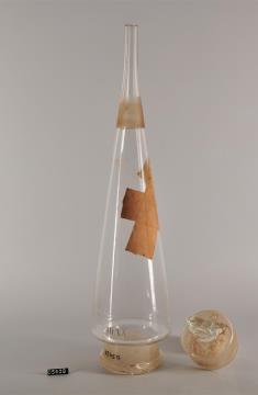 Konisches Gefäß aus starkem farblosem Glas, Auslauf ohne Ablasshahn mit Schliffstopfen für die Einfüllöffnung. Stopfen hohl mit kleiner Öffnung und flacher Handhabe. Stopfen und Glasgefäß graviert mit der römischen Zahl XVIII. Unteres Drittel des Gefäßes geschliffen. Starker Glasfaden um die Einfüllöffnung. Seitlicher Sprung mit Leukoplast gesichert. Diente wahrscheinlich zum Herstellen von Tinkturen.
