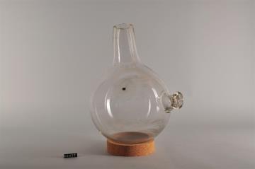 Destilliergefäß, Retorte: eiförmiger Körper mit absteigendem Rohrteil (Schnabel). Schnabel beschädigt. Obere Öffnung (Tülle) zum Einfüllen, hergestellt durch Aufschmelzen eines kleinen Glaspostens und ausziehen desselben. Aufgelegter Faden am Mündungsrand.