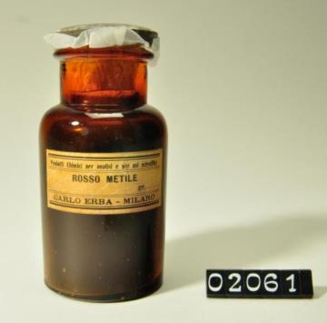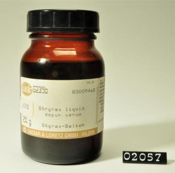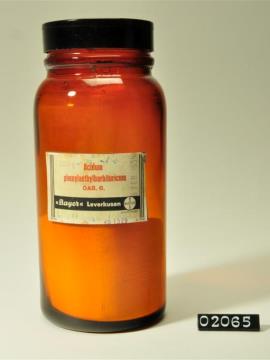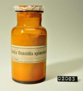 Rundes, braunes Pulverglas mit Korksptopfen mit goldener Kappe. Siegel an Faden um Hals. Etikettiert
