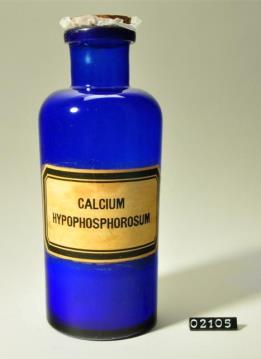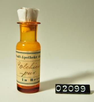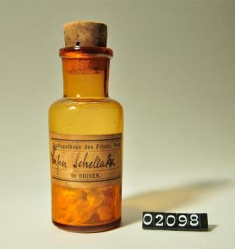Rundes, hellbraunes Pulverlglas mit Korkstopfen. Flacher, ausladender Mündungsrand. Etikettiert
