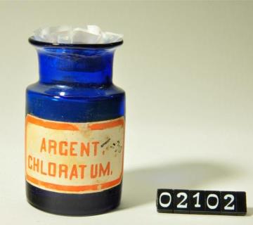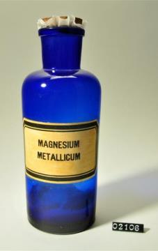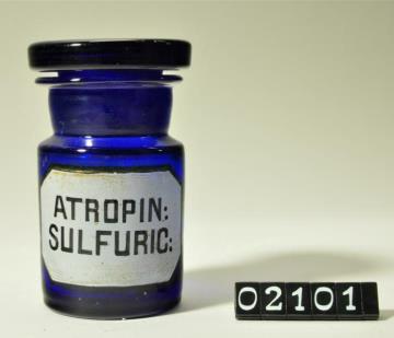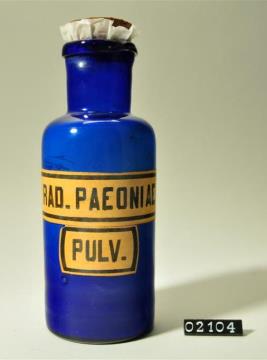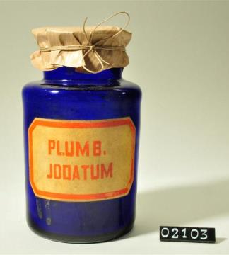 Rundes blaues Pulverglas mit Korkstopfen. Mündungsrand mit umgelegtem Faden. Leicht hochgestochener Boden. Schwarz signiert Pulvis fumalis nobilis. Enthielt Räucherpulver.