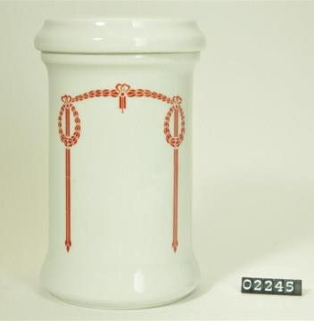 Zylinderförmiger Porzellantiegel mit Stülpdeckelrand, geschweiftem Rand und geschweiftem Fuß. Stülpdeckel mit Kehlung. Standring. Standboden plan. Ohne Signatur. Jugendstilähnliche, rotbraune Randdekoration (Blattgirlande mit Bändern).