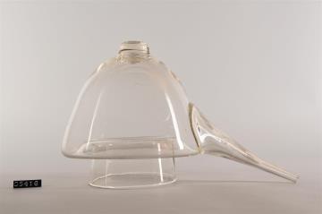 Alambik, Alambique, Alembicus, Destillierhelm, Brennhut, in der Alchemie auch Caput Mauri, Capitellum oder Galea genannt aus grünem Waldglas. Schnabel teilweise abgeschlagen. Viele Lufteinschlüsse. An der Oberseite abgebrochener Glasposten zum Anheben des Helms. Diente zur Trennung von Stoffen durch Erhitzen und anschließendes Abkühlen. Ähnlich der Retorte weist der Alembic ein langes, seitlich nach unten führendes Rohr auf, durch das das Destillat in ein Auffanggefäß abfließen kann Der Boden des Alembik ist jedoch offen, sodass er auf den eigentlichem Destillierkolben gesteckt werden kann.